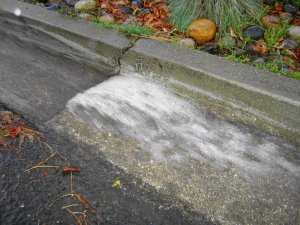 Little raindrops on twigs, that water rushing in the gutters pushing itself past small barriers: Twigs and a leaf that probably fell from a tree in November and was never blown by the wind from its place.
