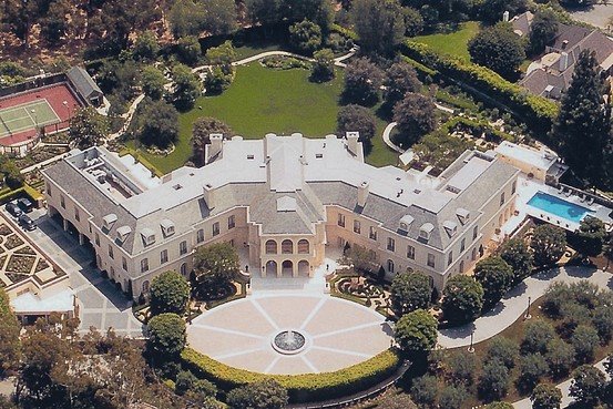 But here’s what you get for $150 million! A three-story French chateau-style mansion built in 1991 on five acres. It boasts a private bowling alley, beauty salon, gift-wrapping room, wine cellar, and screening room. Outside is a swimming pool, tennis court, tennis court, and citrus orchard.
