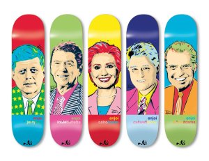 The decks highlight the sport, its history, and its eclectic , iconoclast culture. The decks are bright, colorful, and represent a variety of themes. Some make brash political or social commentary. Others depict more subdued urban street scenes of images of nature.