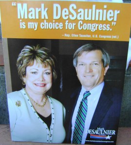 This arrived in my mailbox today. It’s a glossy, eight-page brochure from state Senator Mark DeSaulnier with a full-page color photo of him with Ellen Tauscher, whose former 10th congressional seat he is running to fill. As you can see, it reads “Mark DeSaulnier is my choice for Congress.”