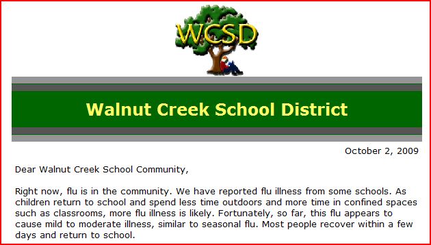 UPDATE: Walnut Creek School District Superintendent Patricia Wool sent out an advisory Friday afternoon to parents. She noted that “flu is in our community” without mentioning the words “swine flu” or “H1N1” as being involved in recent illnesses cropping up in the district’s elementaries or middle school.