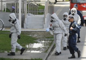 This method of “detergent suicide” has become the subject of worldwide news reports, and according to this 2008 Wired report, this suicide fad—if you can call it that—apparently originated in Japan. This photo shows Japanese police officers in protective gear entering an apartment in southern Japan in April 2008. A Japanese girl had gassed herself to death by mixing laundry detergent with cleanser, creating fumes that sickened 90 people in her apartment house. As Wired said: