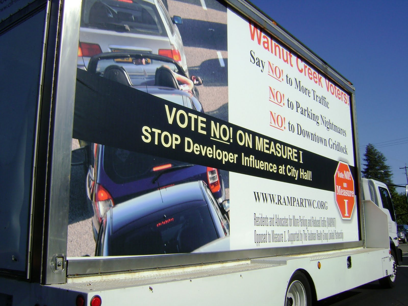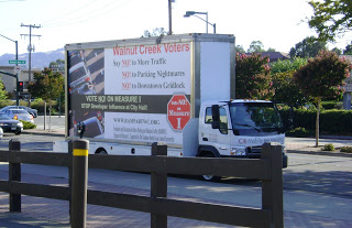 I was going east on Newell Avenue, and up ahead (!)I see one of these billboard trucks that I heard that the RAMPARTWC backers were going to hire to visually broadcast to Walnut Creek voters the message that they should vote “no” on Measure I November 3.