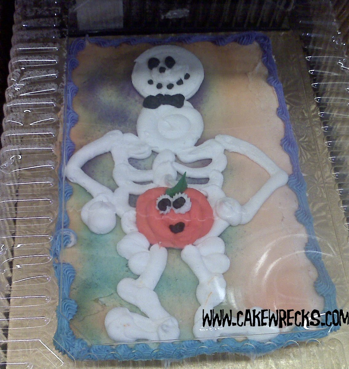 The headline for this very special skeleton cake is “Step One: Cut a Hole in a Pumpkin,” followed by “I can’t think of a more Wreckstastic harbinger of Halloween happiness than this guy. … Yep, Mr. Boneheard here suuure is happy. How happy, you ask? Happy enough to say, “Look, ma! No hands!”