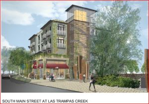 Notably, it will feature a “pedestrian promenade” along Las Trampas Creek (the view you’re seeing here), and the developer will improve the Main Street bridge pedestrian crossing. For creating this “Creek Walk,” which qualifies as a new park area, and bridge improvements, the developer, Essex Trust, will get out of paying $200,000 in fees.