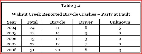 One major concern is bicycle safety for cyclists. However, it appears that the people most in need of bicycle safety education are the cyclists themselves. Of the 109 bicycle crashes in Walnut Creek from 2004 to 2008, the majority were caused by the cyclists, primarily by riding on the wrong side of the road. Remember, as the draft plan says, every person riding a bicycle upon a street or highway is subject to the all the duties applicable to a driver of a vehicle.