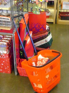 Are you out and about today shopping? I just had to pick up some last-minute things–sparkling wine for a party, and, psst, something to go with my husband’s present. I went to Cost Plus in Walnut Creek, and discovered these shopping baskets that have little wheels on them.