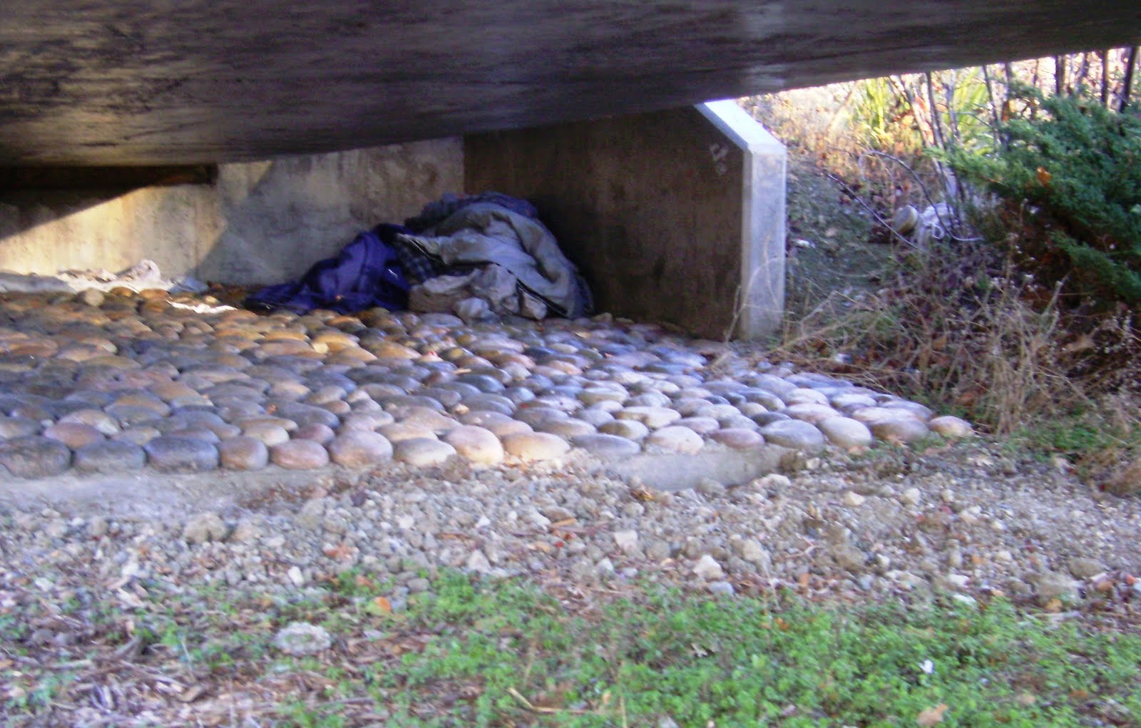 A roof over one’s head? Well, that’s something right? Found one man or woman’s retreat under the Ironhorse Trail bridge that crosses Ygnacio Valley Road this morning. A sleeping bag, a pair of shoes … Maybe someone slept there last night, and will do so again tonight, and tomorrow night, Christmas Eve. Or maybe this denizen of our community, temporary or not, has found another place to stay, has moved on–but left behind some belongings that could still be very the cold nights we’re having.