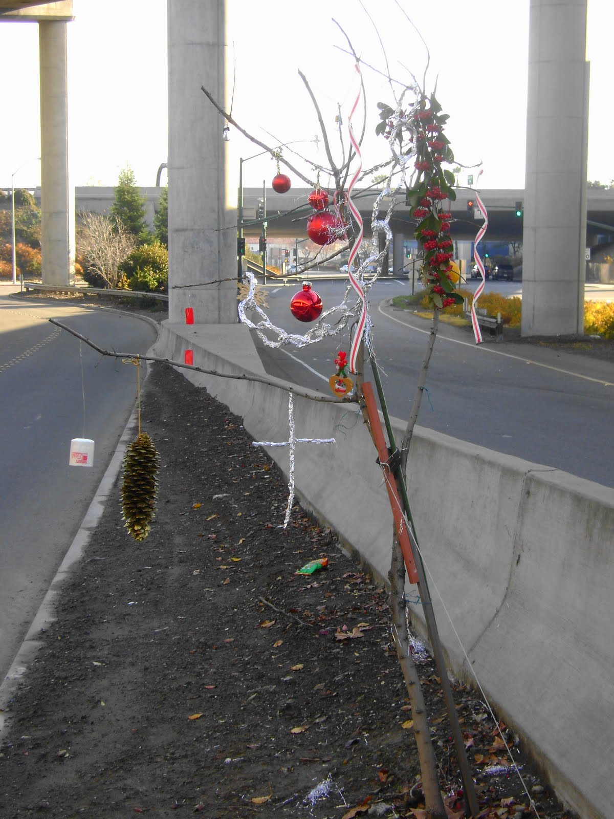 My neighbor–a beautiful soul–has watered and decorated that tree for several years. Sadly it died this summer, but she decorated it all the same. I was so sad to see that someone had knocked it down at the beginning of the week…but I'm so happy to see your picture. I had been meaning to take one and regretted that I hadn't. Thanks for sharing it!