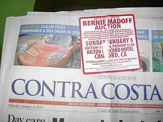 A sticker advertising this auction appeared on the front page of Saturday’s print edition of the Contra Costa Times. In fine print, though, the sticker said that the items up for sale did not come from the Madoff estate but came from his victims, and were being sold to “recoup their losses.”