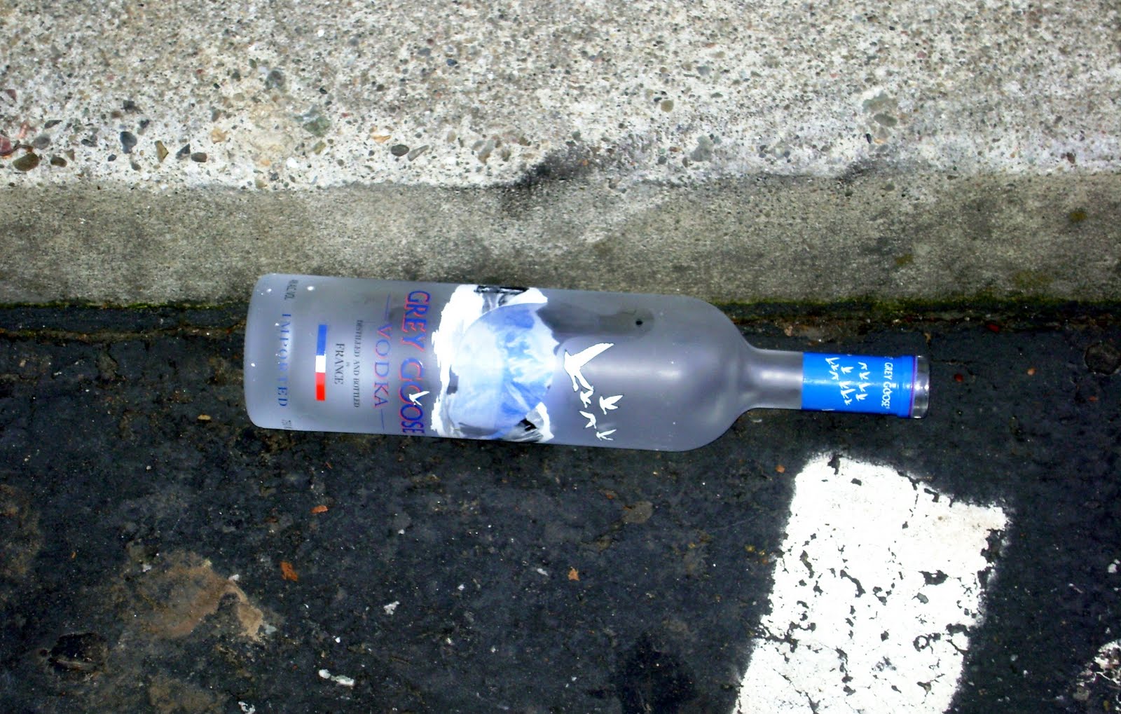 Anyway, some slob left this empty bottle of Grey Goose French-made vodka in the gutter outside my bank’s ATM on North Main Street. This slob–and maybe some of his or her buddies–look like they had a good New Year’s Eve, or Saturday night, ringing in 2010 in style.  I wonder if this slob was wearing a D&G lambskin leather jacket and had a fresh metrosexual mani/pedi job from one of our local spas.