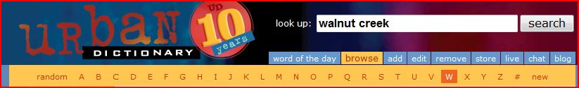 Well, a reader has suggested a good place to find some answers to the question of what makes Walnut Creek Walnut Creek. It’s dictionary, specifically, the online Urban Dictionary. This is a very useful resource for anyone in 2010, especially if you want to understand what your kids are talking about or you want to attempt to sound cool in front of your kids. (Good luck with that!)