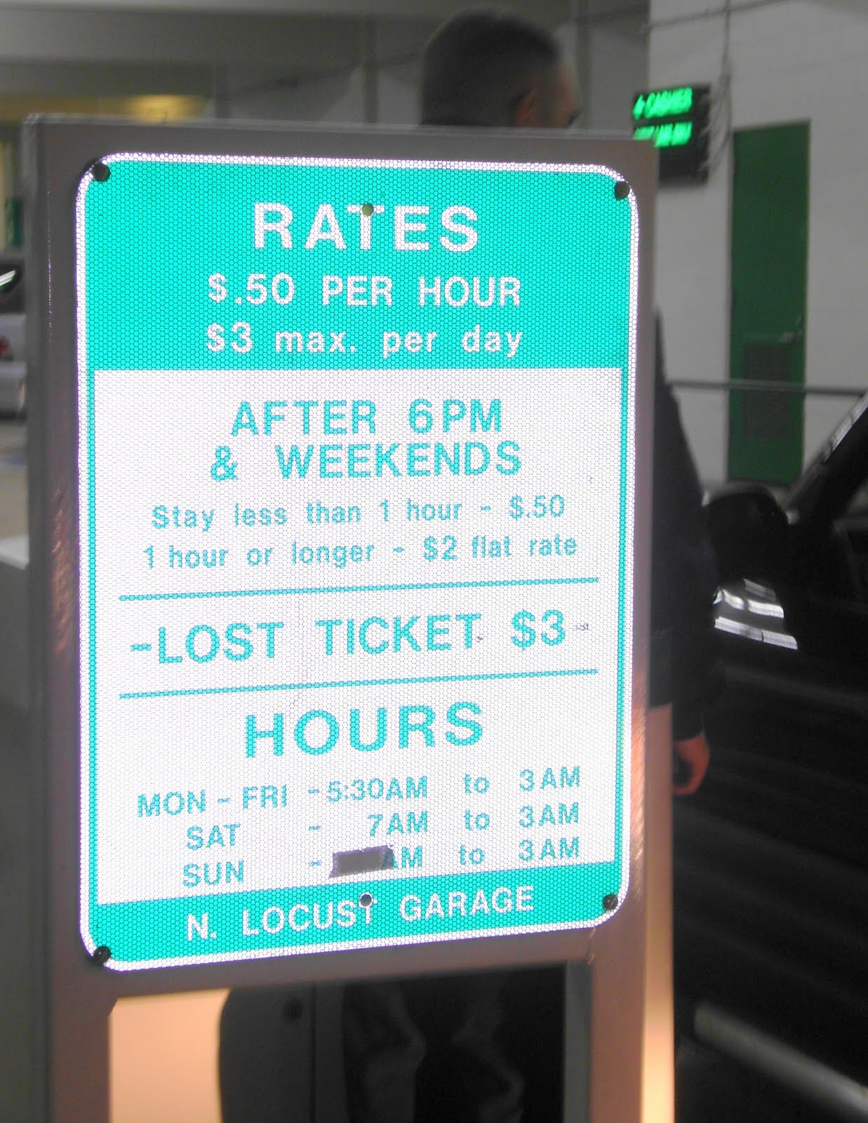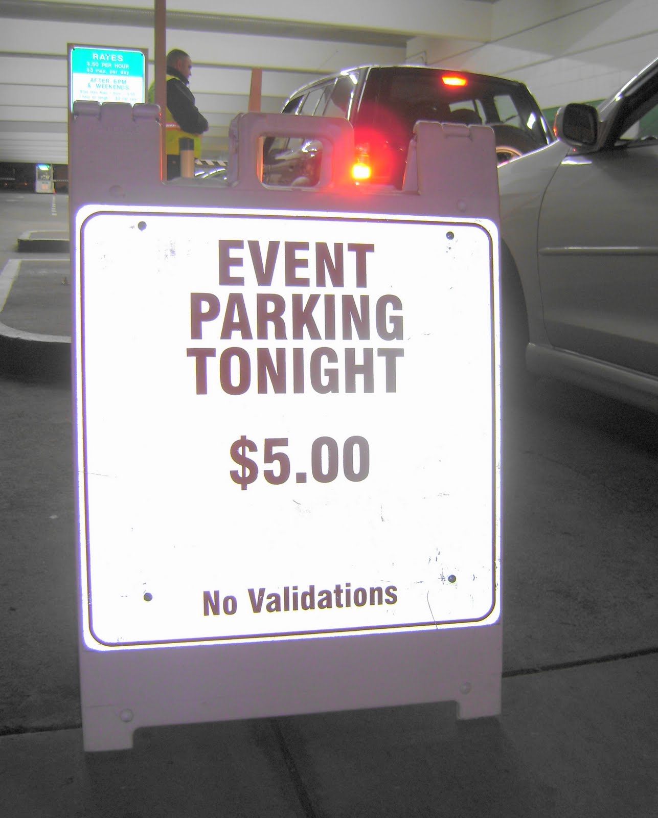 In going to a play at the Lesher Center last night, I parked in the the North Locust Garage, right next door to the center.As on pretty much most Friday and Saturday nights, when the Lesher Center is staging one or more productions, the garage was charging a Special Event parking fee.