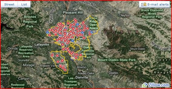 All those little red houses, like pieces on a Monopoly board, signify homes in foreclosure in Walnut Creek, according to Zillow.com. The concentration of red on this map may still not be as bad as you would find in a Zillow map of a more notoriously hard-hit East Contra Costa County town such as Antioch. But, still it is disconcerting to see this happening in Walnut Creek neighborhoods–and sad for the people facing foreclosure.