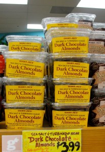 –Dark chocolate almonds sprinkled with sea salt and turbino sugar. From Trader Joe’s. Actually, Trader Joe’s is a chocolate lovers’ dream–or downfall.