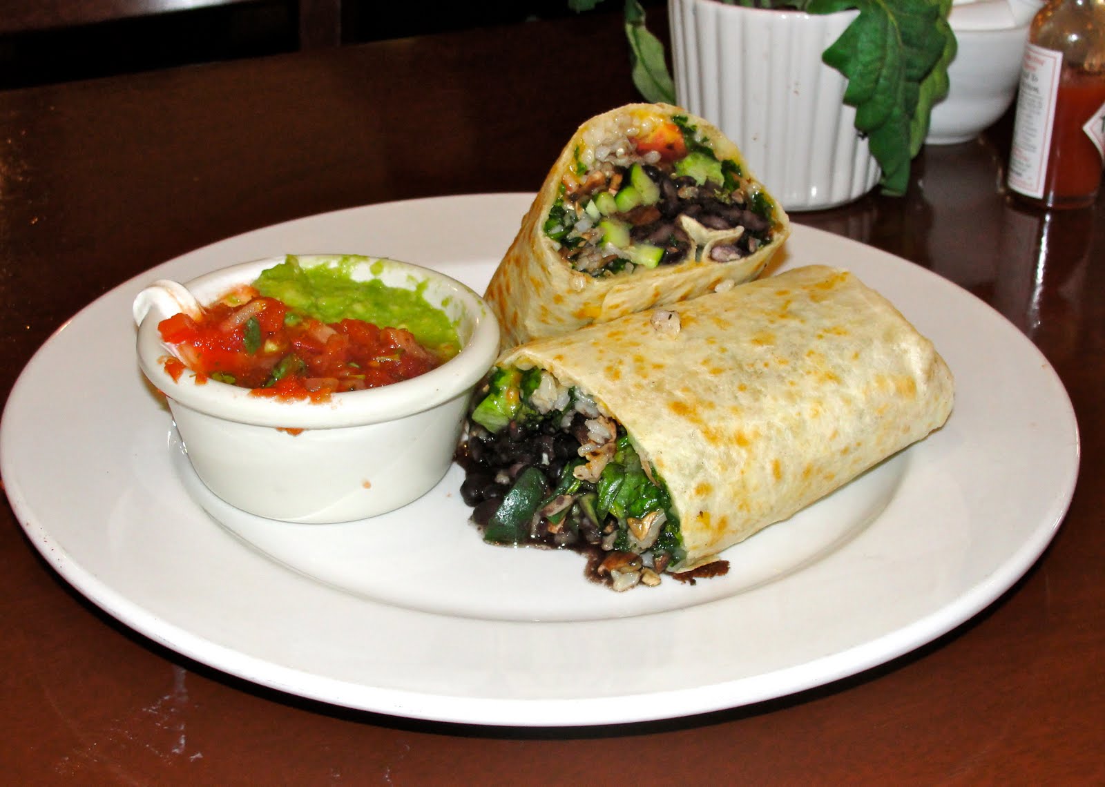 –The vegetarian burrito at Sunrise Bistro: Filled with the usual black beans and rice and cheese, as well as lots of veggies: broccoli, zucchini, and spinach. It comes with salsa and guacamole. It’s big and satisfying, but, like other Sunrise Bistro fare, it feels healthy. A vegan version is also available with tofu replacing cheese.