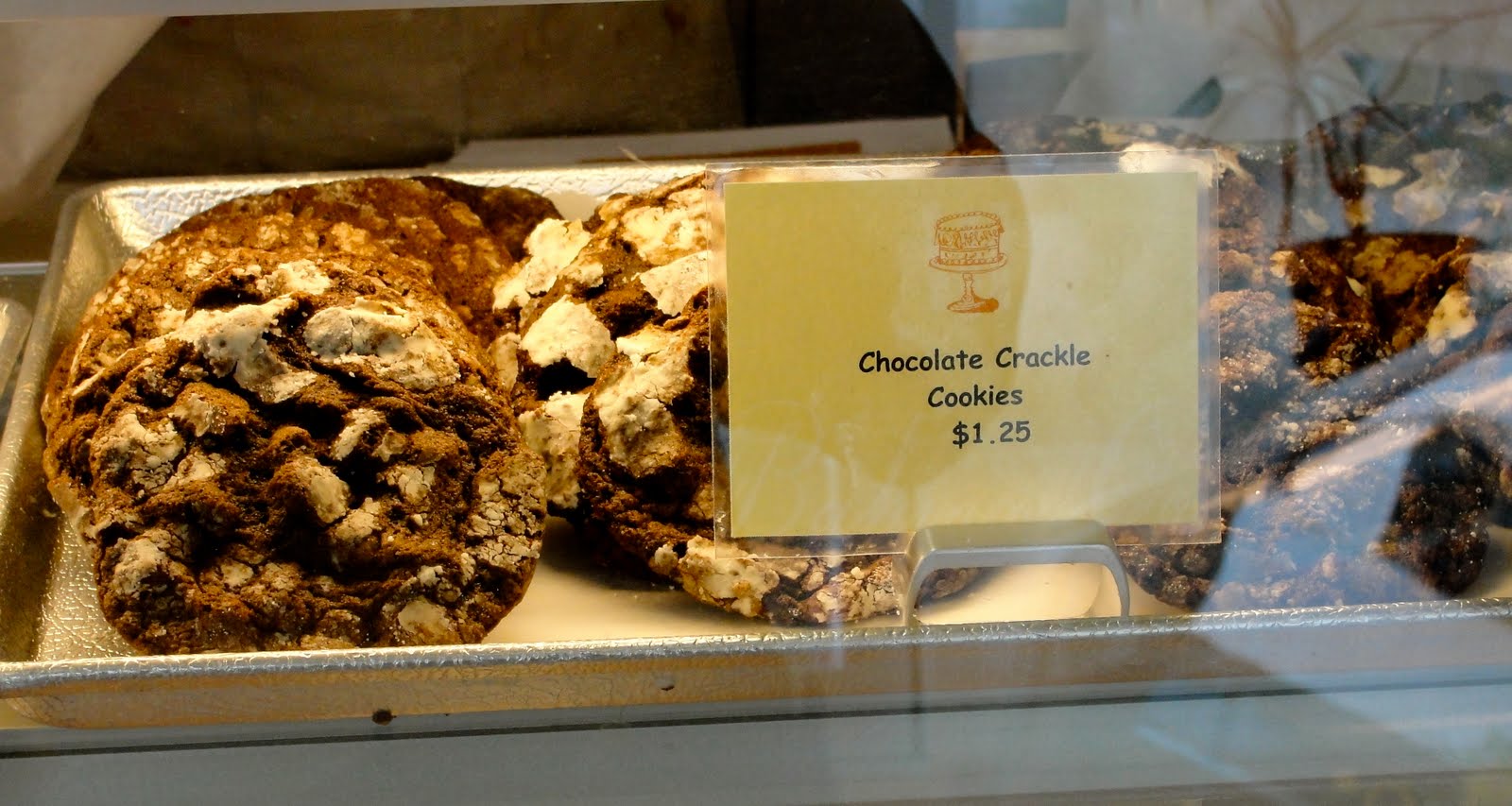–Chocolate crackle cookies and Gingeroos (soft ginger cookies) from the Walnut Creek Baking Company. The crackle cookies are like chewy brownies in cookie form.