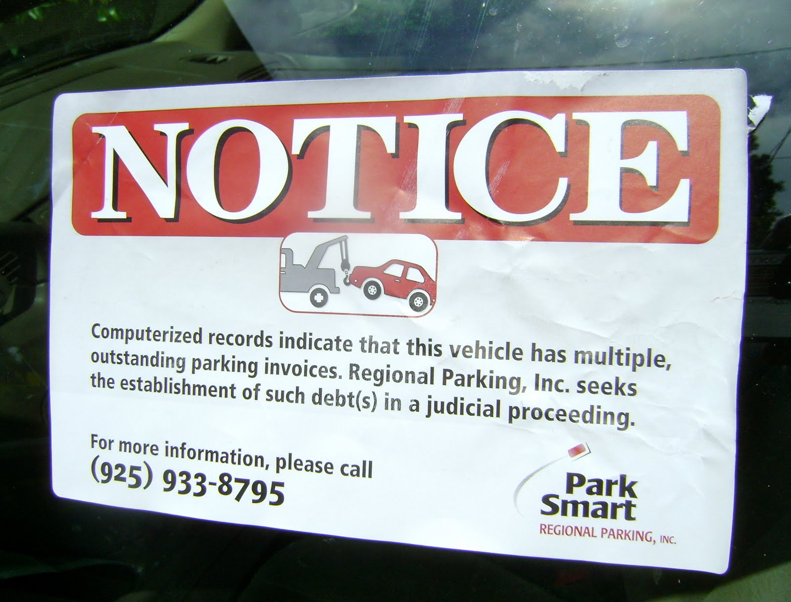 I came out of Peet’s at about 10:42 a.m. and found this sign pasted on my window: “Computerized records indicate that this vehicle [my Toyota Camry] has multiple outstanding parking invoices. Regional Parking Inc., is seeking the establishment of such debt (s) in a judicial proceeding.”
