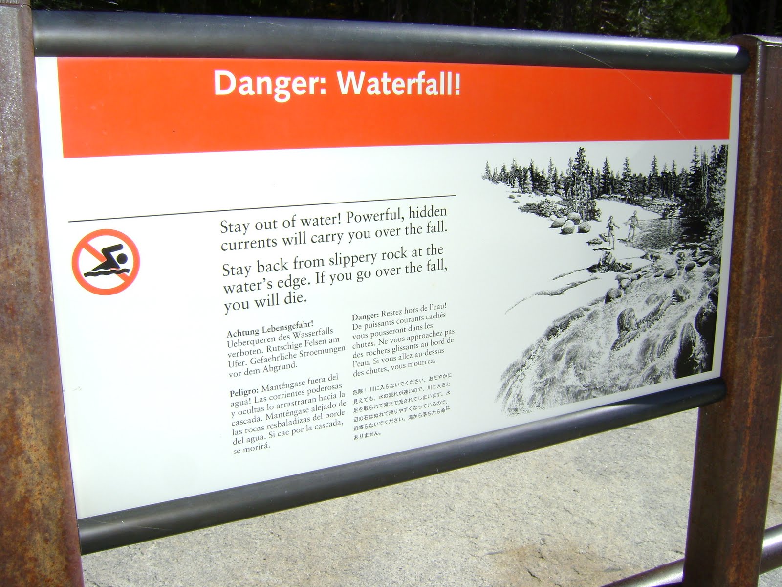The sign along a pool at the top of Nevada Falls, two miles up the Mist Trail from Vernal Falls, says things in pretty stark terms. “If you go over the fall, you will die,” says the sign, pictured here. I snapped this photo on a hike to the top of Nevada Falls in October 2009.