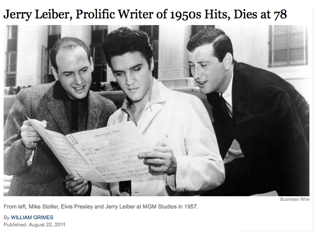 As it happens, I wasn’t looking up anything Smokey Joe’s-related. I was checking on events in Libya and the rest of the world. And there, below the latest news on the downfall of Quadafi and sniping amongst Washington politicians were stories about Leiber, Stoller, “Hound Dog,” and Elvis Presley.