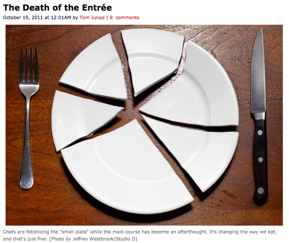 We’ve “been conditioned to think of the entree as the climax of the meal,’ he writes in his article and blog post “The Death of the Entree.” “It is, indeed almost always disappointing.”