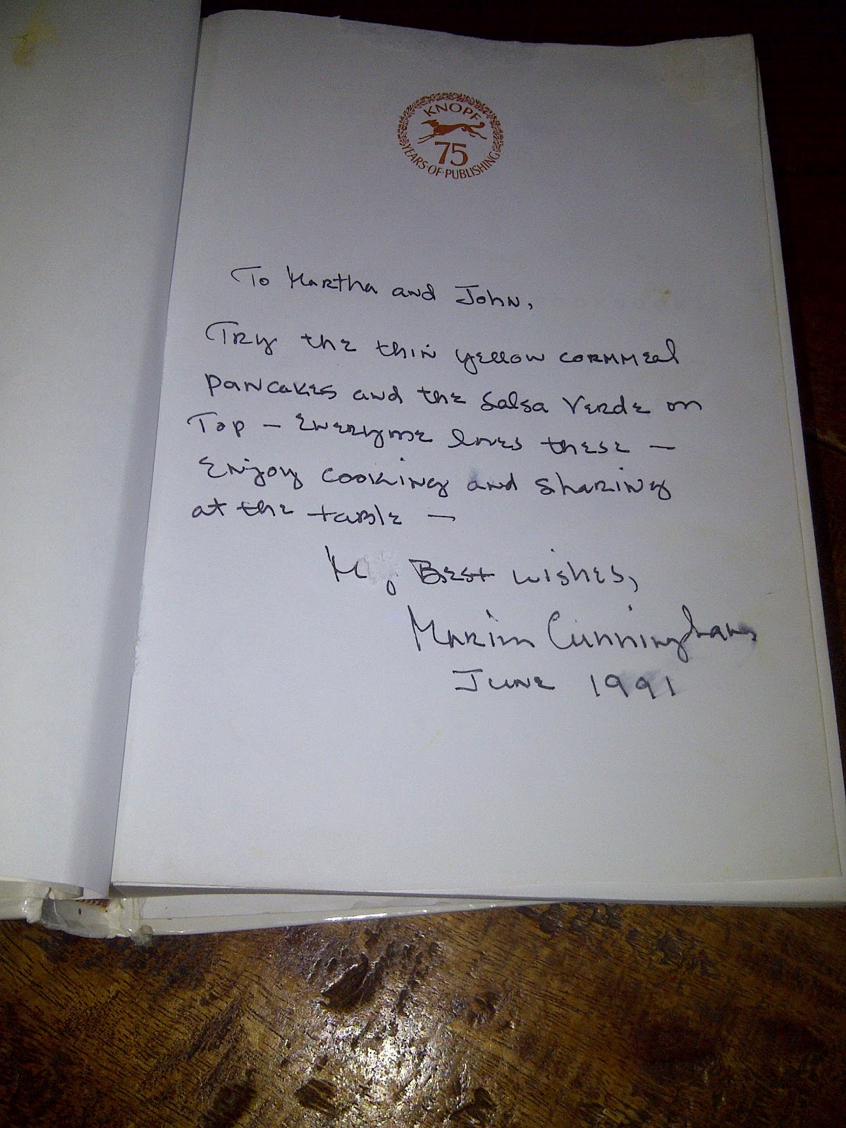 The wedding present was this copy of The Fannie Farmer Cookbook. Mrs. King, who lived here in Walnut Creek was neighbors of Cunningham, so apparently she went around to Cunningham’s house or something like that and asked her to sign it before she and her husband presented it to us. Cunningham recommended we try cooking the Thing Yellow Cornmeal Pancakes on page 548 and topping them Salsa Verde, which is a concoction of garlic, cilnatro, jalapeno pepper and tomatillos.