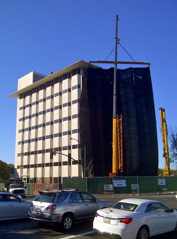 The eight-story white building at the corner of Newell Avenue and South Main Street, which once housed Security Pacific Bank founded by U.S. Rep. Pete Stark, is coming down. (Maybe like his political career? We’ll find out later today!)