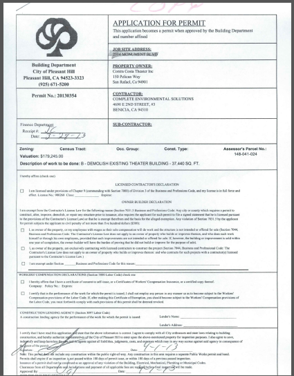 We filed the appeal with the city’s planning department on Monday but SyWest Development received a demolition permit (right) and, technically, could start knocking down the theater before then, public information officer Martin Nelis told Pleasant Hill Patch.