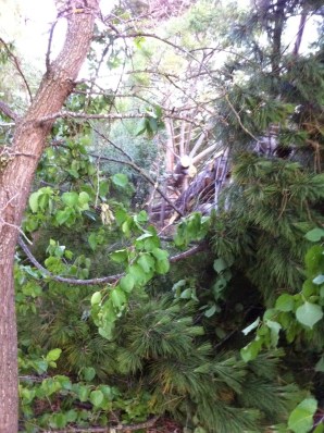 The tree was a Monterey pine, and it had crashed across our fence and probably destroyed the two other trees, though it was hard to see amid all the tangle of branches. It may have also caused a crack in our trellis. But no utilities were threatened, and our house was spared. We called to file a claim with the insurance company, and talked to neighbors, notably those next door who owned the tree.