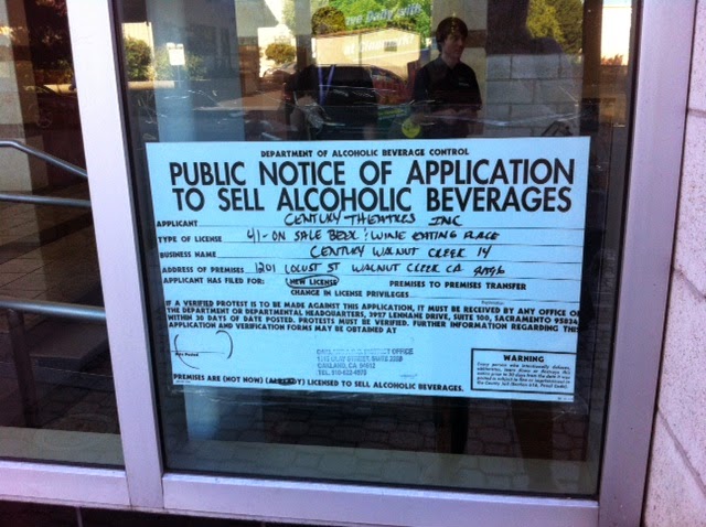 So along with buying popcorn and nachos with that neon orang-y cheese, patrons at the Century Walnut Creek 14 will soon also be able to buy a glass of wine or beer. This is according to a “Public Notice of Application to Sell Alcoholic Beverages,” posted in one of the windows of the movie theater facing Locust Street.